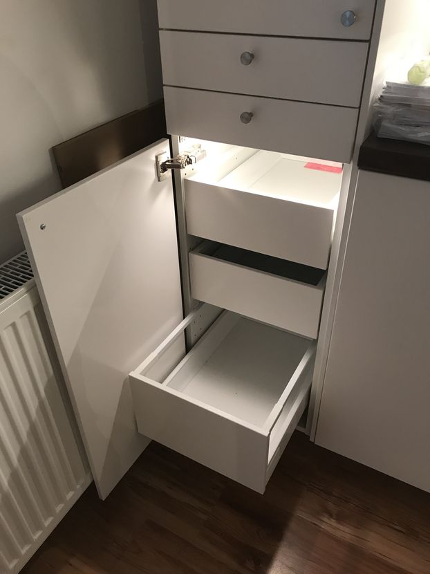 Die moderne Küchenzeile überzeugt mit einem Kühlschrank, Backofen, Cerankochfeldern und einer integrierten Dunstabzugshaube. Einige Schubladen sind zusätzlich mit Beleuchtung ausgestattet, und es gibt eine praktische Nische mit allen Anschlüssen für eine eigene Waschmaschine.